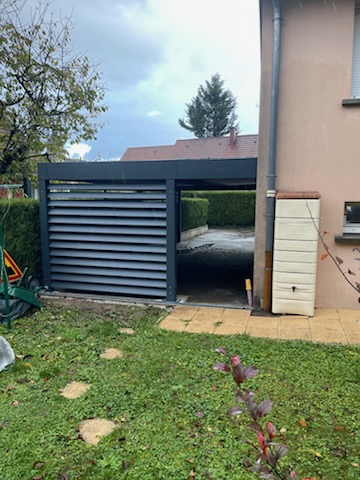 La toiture du carport est réalisée en bac acier anti-condensation : un matériau robuste qui garantit une protection efficace contre la pluie, la neige et les UV tout en réduisant la formation de condensation sous l’abri — un avantage important pour protéger les véhicules et prolonger la durée de vie de la structure. Pour compléter le design et améliorer l’intimité visuelle, un claustra en lames d’aluminium RAL 7016 a été intégré sur le côté du carport, alliant fonctionnalité et esthétique. Ce type de brise-vue en aluminium protège des regards extérieurs et peut contribuer à créer un espace d’abri plus confortable et privé, tout en valorisant l’ensemble de l’installation.