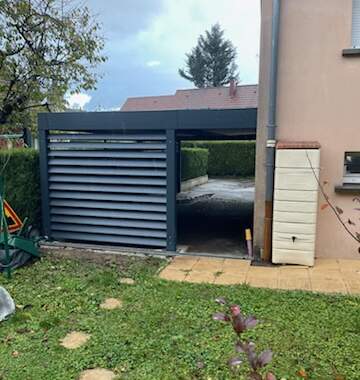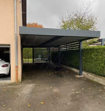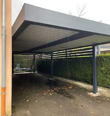La toiture du carport est réalisée en bac acier anti-condensation : un matériau robuste qui garantit une protection efficace contre la pluie, la neige et les UV tout en réduisant la formation de condensation sous l’abri — un avantage important pour protéger les véhicules et prolonger la durée de vie de la structure. Pour compléter le design et améliorer l’intimité visuelle, un claustra en lames d’aluminium RAL 7016 a été intégré sur le côté du carport, alliant fonctionnalité et esthétique. Ce type de brise-vue en aluminium protège des regards extérieurs et peut contribuer à créer un espace d’abri plus confortable et privé, tout en valorisant l’ensemble de l’installation.
