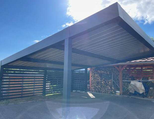 La toiture marie un bac acier, reconnu pour sa durabilité et sa protection contre les intempéries, à des panneaux photovoltaïques intégrés, permettant d’allier protection de véhicule et production d’électricité verte. Cette solution innovante incarne l’engagement écologique et technique de SC Habitat. Pour davantage de confort visuel et d’intimité, un brise-vue en lames d’aluminium RAL 7016 ajourées de 50 mm complète l’ensemble avec élégance, ajoutant une finition contemporaine tout en respectant l’ambiance du site.