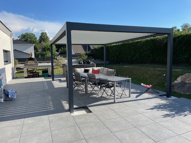 À Bessoncourt, commune rurale proche de Belfort, SC Habitat a conçu et installé une pergola bioclimatique en aluminium thermolaqué RAL 7016, spécialement conçue pour être posée librement sur une terrasse située devant une piscine. Cette configuration sans vis-à-vis permet une installation flexible, sans nécessiter de fixation murale, idéale pour créer un espace de vie extérieur convivial et esthétique. L’aluminium, matériau noble et durable, assure une grande résistance aux intempéries tout en nécessitant très peu d’entretien — un avantage évident au bord de l’eau